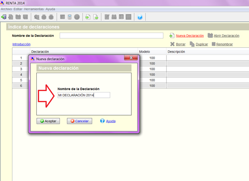 Se abrirá en ese momento otra pantalla que te pedirá que asignes un nombre a la declaración. Elige un nombre y haz clic en Aceptar.