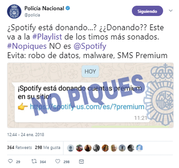 La Policía Nacional está advirtiendo en su cuenta de twitter sobre una oferta "bastante sospechosa" que circula por redes sociales. En dicho mensaje te invitan a acceder a una url para conseguir gratis una cuenta Premium de Spotify. Por supuesto lo que los estafadores pretenden es robarte los datos al registrate como cliente. Por lo tanto, no piques. Ni piches ni lo compartas. Como si nada.