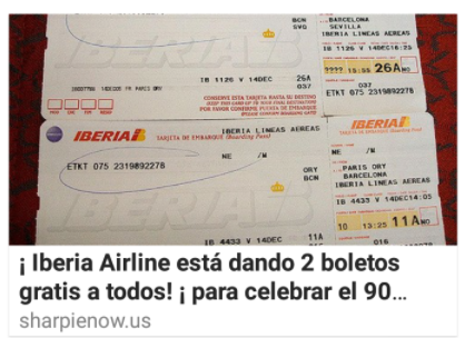 Otro bulo que empieza a circular por las redes sociales es el de que Iberia está regalando dos billetes "a todos" para celebrar su 90 aniversario. Por su puesto, es mentira. La compañía ya ha desmentido dicha farsa.