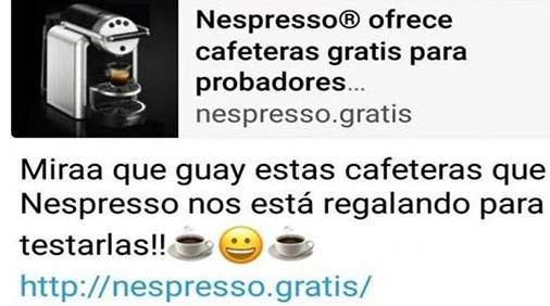 Y tampoco pinches en el link que aparece, si lo haces la página web a la que te dirige, ofrece cafeteras de prueba por parte de Nespresso a cambio de que metas tus datos personales en los campos requeridos. El problema está en que estas cafeteras no existen y en realidad te estás suscribiendo a un servicio premium.