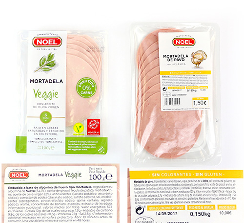 Nos fijamos en la etiqueta de estos dos productos de mortadela de pavo Noel. No encontramos el % de carne en el producto final que se ha empleado para esta receta (incumpliendo, por cierto, la normativa de etiquetado).