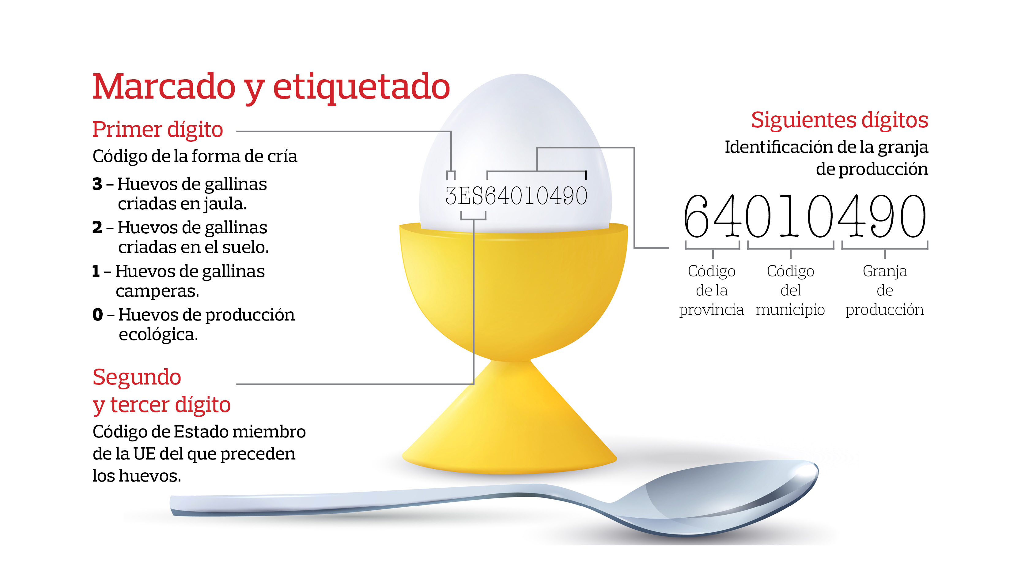 Coge el huevo y mira la cifra que tiene estampado en la cáscara. No es un código secreto, es el código de identificación que el productor está obligado a marcar desde el 1 de enero de 2004. Este número esconde una información muy valiosa para el consumidor de los huevos envasados o a granel (categoría A).