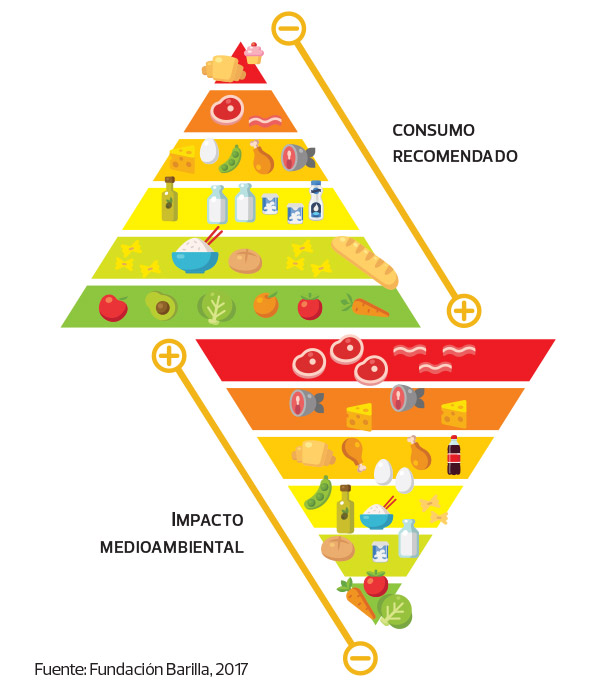 Las pirámides alimentarias, de las que hay distintas versiones, se centran en destacar aquellos alimentos que desde una perspectiva nutricional deben ser la base de nuestra dieta, los que debemos comer más frecuentemente, en contraposición a los que, menos saludables, deberíamos consumir solo de manera esporádica… Pero si nos fijamos en el criterio de respeto al entorno, la cosa cambia, como vemos en la imagen de la fundación Barilla, donde se muestran aquellos alimentos cuya producción deja una mayor huella en el medio ambiente, cuyo consumo deberíamos limitar, y aquellos que tienen menor impacto en el entorno, los que deberíamos consumir más.