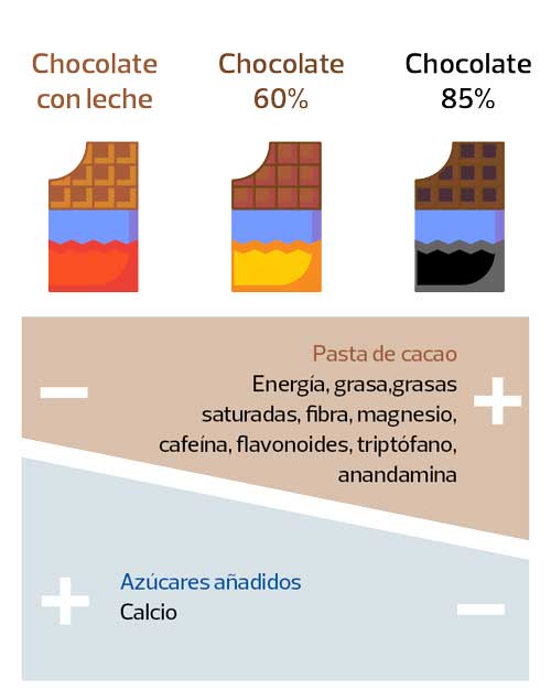 Cuanto más “puro” es el chocolate (mayor % de cacao), más grasa, fibra y energía aporta. También aumenta la cantidad de proteína, pero esto último no aplica al chocolate con leche pues este último ingrediente aporta un “extra” de este nutriente.