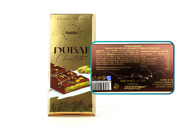 La versión original es una tableta de chocolate con leche con relleno denso de crema de pistacho y capas de kataifi/kadayif (fideos de masa filo deshilachada, crujientes), inspirada en el postre de Oriente Medio knafeh. Se trata de una creación de repostería conocida como “Can’t Get Knafeh of It” de la chocolatería Fix Dessert Chocolatier, de Dubái, y hoy se vende mediante distribuidores por todo el mundo. El precio que anuncian en su página web es realmente elevado, para bolsillos dubaitís: 200 gramos cuestan al cambio unos 59 euros, ¡295 euros el kilo! (costes de transporte aparte).