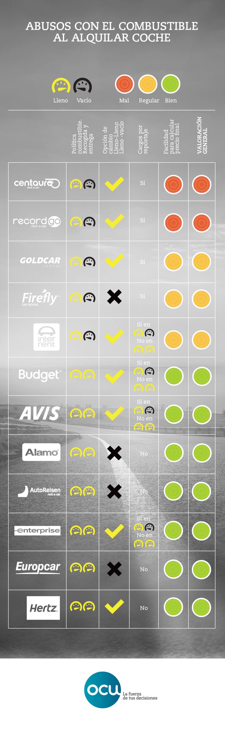 Muchas empresas de alquiler de coches dicen que te van a cobrar una cosa, pero luego te sorprenden con otra más: el combustible. Algunas te cobran por el depósito lleno. Otras no te dejan elegir si quieres devolverlo lleno o vacío. Tanta confusión la acabas pagando tú.