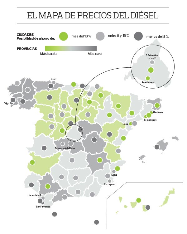 En este mapa te mostramos cuáles son las provincias más caras y más baratas para repostar diésel y las ciudades con posibilidades de ahorro de más del 13% y menos del 8%.
