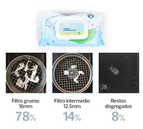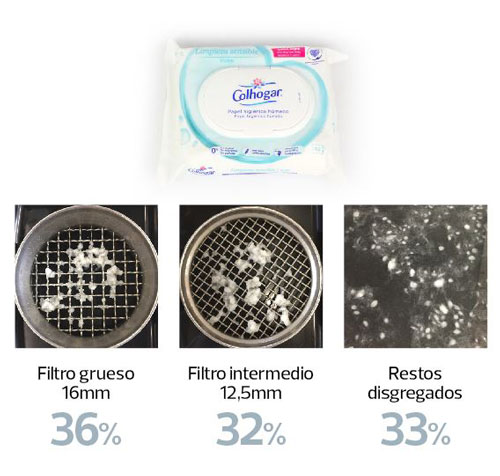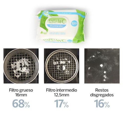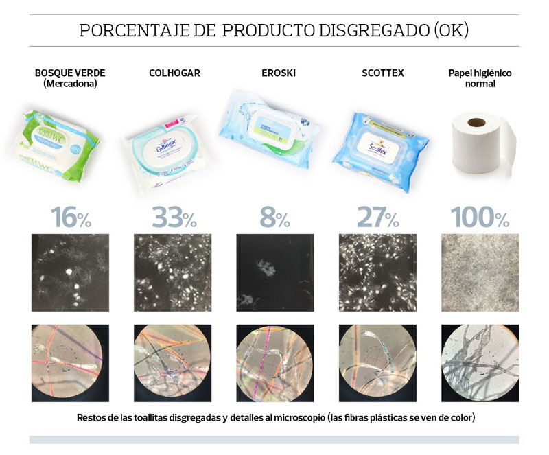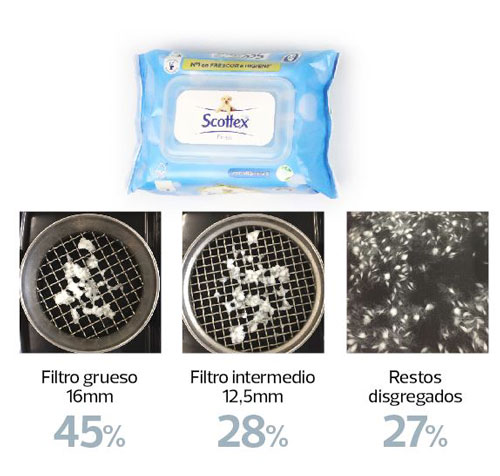 Las conclusiones del estudio revelan que son toallitas que contienen fibras sintéticas, que no logran disgregarse después de 48 horas de agitación. Por lo que en las escasas horas que tardan en llegar a las depuradoras seguirán causando los mismos problemas que ya conocemos de atascos en los bajantes de edificios y en redes de saneamiento comunitarios.