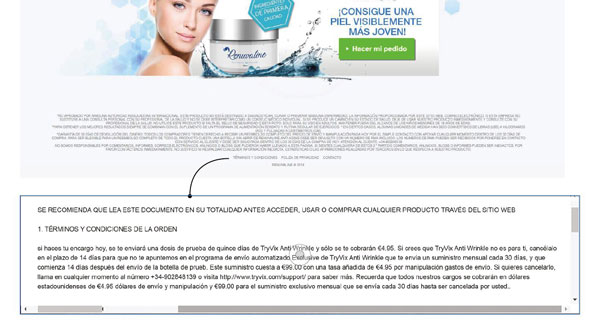 Sin entrar en la calidad o en la eficacia de estas cremas antiarrugas, hemos detectado que estas páginas web ofrecen muestras de cremas gratis a cambio de pagar solo los gastos de envío de 4,95 euros. Pero desgraciadamente aquí no acaba todo, el problema viene que al dar tus datos bancarios y confirmar el envío, sin saberlo estás aceptando una suscripción mensual de 99 euros.