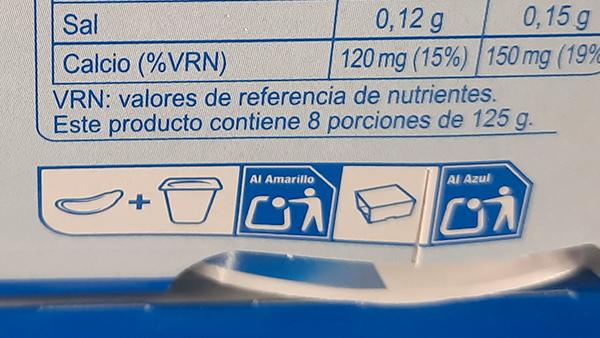En el caso de los yogures en pack, vemos estos dos ejemplos, los dos con información correcta y comprensible, indicando por separado dónde tirar el vasito (amarillo de envases), la tapa del yogur (amarillo de envases) y la faja de cartón que agrupa los yogures (azul de papel).