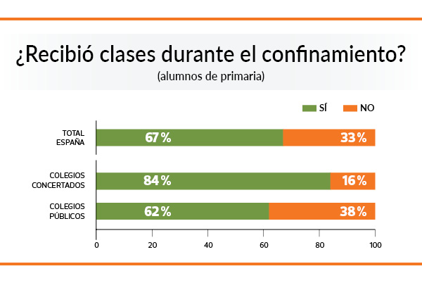 Entre los alumnos de colegios públicos solo el 62% tuvo clases online por videollamada con alguno de sus profesores frente al 84% de los alumnos de colegios concertados, y un dato importante, tres de cada diez alumnos de primaria se quedaron sin clase.