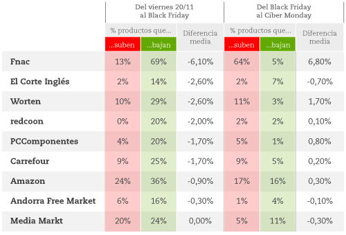 Una de las tiendas más implicadas en el Black Friday, MediaMarkt, fue precisamente la que menos rebajas hizo: de media un 0%. Aunque bajaron el precio del 24% de sus productos, lo compensaron subiendo los de otro 20% de productos. Echando cuentas, el balance se queda a cero, como si nada hubiera pasado.