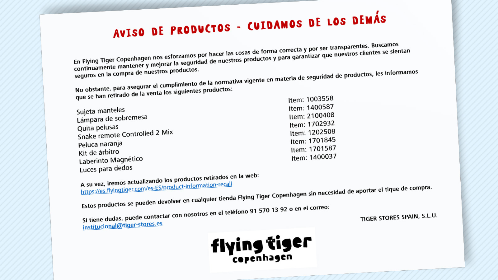 Tiger facilita un teléfono de contacto 91 570 13 92 y una dirección de correo electrónico donde atenderá las posibles dudas. La compañía asegura que bastaría con llevar el producto a cualquiera de sus tiendas para su devolución incluso sin necesidad de aportar el tique de compra.