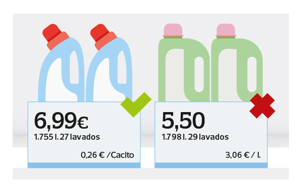 - Precio equivalente en detergentes a máquina. Los precios equivalentes que han de aparecer en los detergentes a máquina es por cacito y no por litro o kilo.