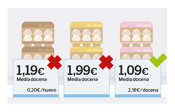 - El precio equivalente siempre por docena. Por ejemplo en los huevos sería la docena, aunque se vendan en envase de media docena.