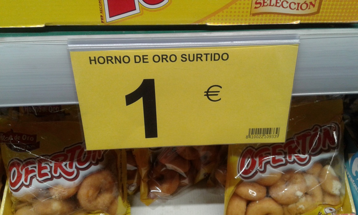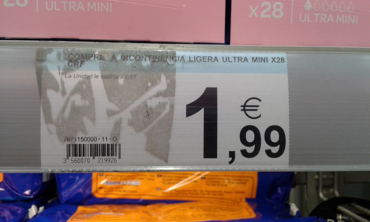 Poner un cartel con una estrella amarilla, por ejemplo, puede propiciar que el cliente piense que se trata de un precio especial, sin que haya en realidad algo que lo indique. El formato en el que aparece el precio, la gran etiqueta amarilla sobresaliendo del lineal, es el mismo que se emplea para promociones. En este caso, sin embargo, nada hace indicar que lo sea, porque no se señala el precio anterior. Así, se da a entender que es una oferta, y no lo es, o si se pretende que sea una oferta, falta el precio anterior. En ambos casos, es incorrecto. Además, lo mencionado de que falta unidad de medida y no está claro de qué producto se trata.