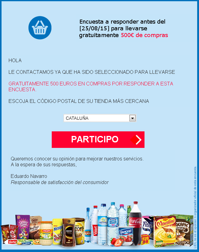 Primero lo intentaron con Mercadona y ahora con Lidl: una falsa encuesta que se hace pasar por el conocido supermercado para recopilar tus datos personales y así poder vendérselos a otros que se dedicarán a spamearte. ¡Que no te la cuelen! Protege tus datos.