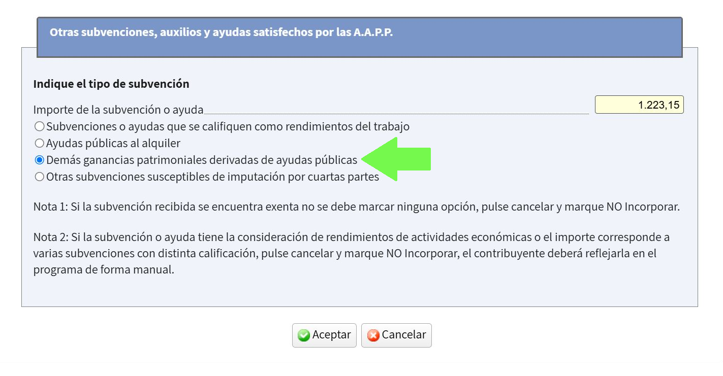 Al empezar, te saldrá un mensaje diciendo que has recibido una subvención y pidiendo confirmación para añadirla a la declaración. Tendrás que aclarar qué tipo de subvención has recibido; la mayoría corresponden al cajón de sastre "Demás ganancias patrimoniales derivadas de ayudas públicas".
