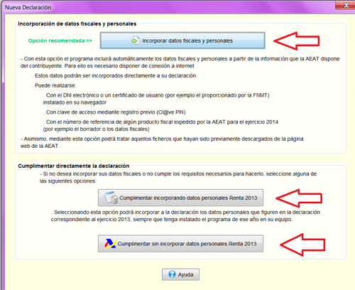 Cumplimentar sin incorporar datos personales de la declaración del 2013. Con esta opción, tendrás que ir incluyendo todos los datos personales y económicos, según te los pida el Programa.
