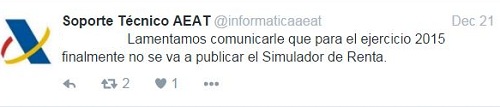 La AEAT no ha informado a través de su web, y por teléfono se limitan a decir que desconocen información al respecto, sino que, ante las consultas de los internautas, el soporte técnico de la AEAT ha explicado en su cuenta de Twitter que este año no se publicará el Simulador de Renta.