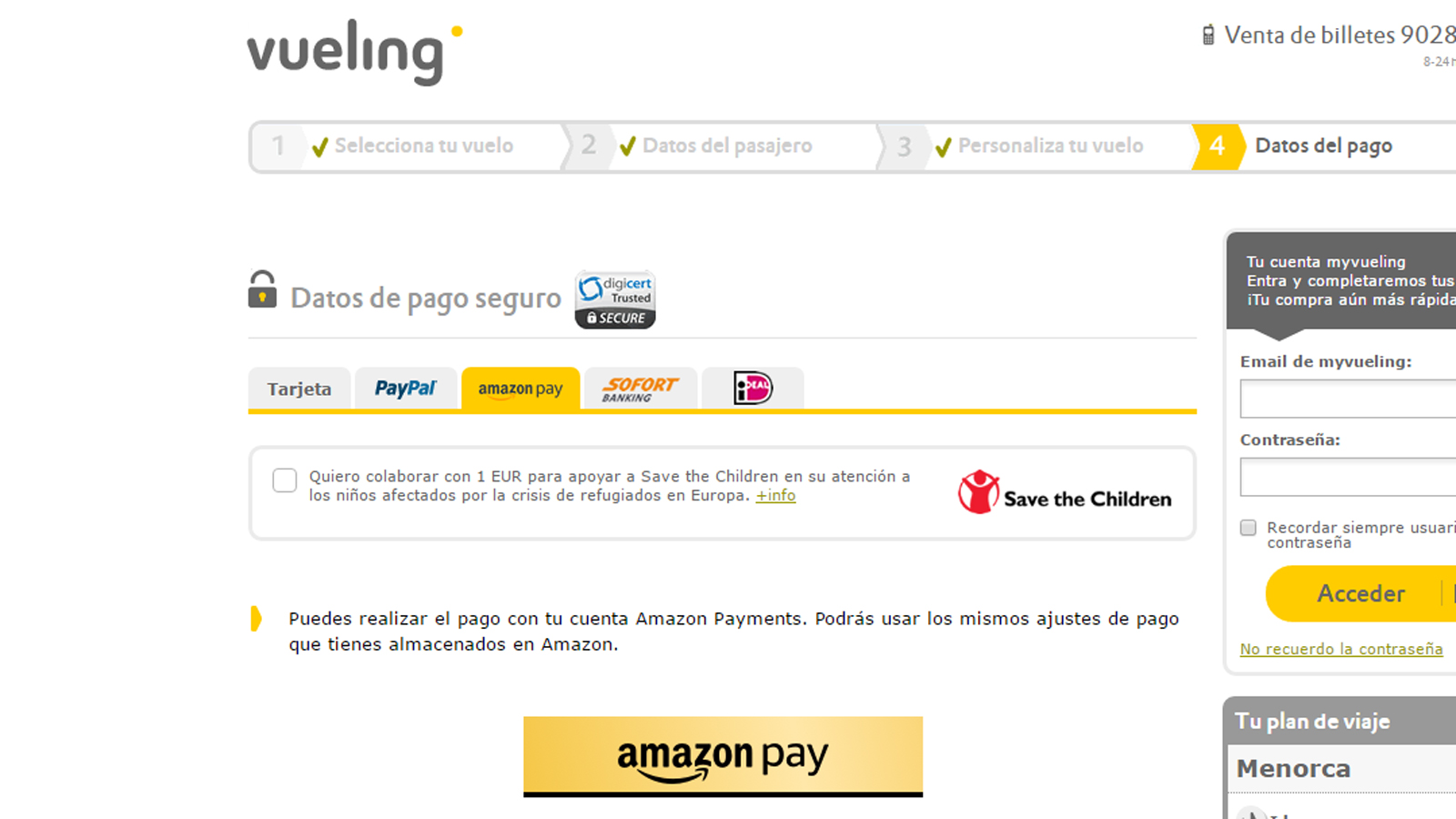 Vueling es una de las primeras tiendas online con la que ya se puede pagar a través de Amazon Pay. Y de momento el consumidor no tendrá que pagar ningún tipo de recargo por el servicio, suponemos que por tiempo limitado. En cambio, si pagas con PayPal, te aplicarán un recargo del 2% del importe de la compra.