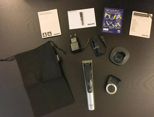 - Equipamiento. En la caja encontramos la afeitadora con una cuchilla ya montada, la fuente de alimentación, una base de carga (un soporte donde se inserta la máquina verticalmente mientras se carga), un peine regulable para ajustar la longitud de la barba entre 0,4 y 10 milímetros, el manual y garantía y un folleto sobre cómo afeitarse.