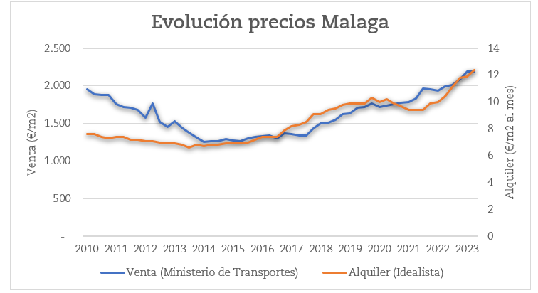 PRECIOS DE LA VIVIENDA EN MÁLAGA EN VENTA (eje izdo, €/m2) y ALQUILER (€/m2 al mes)