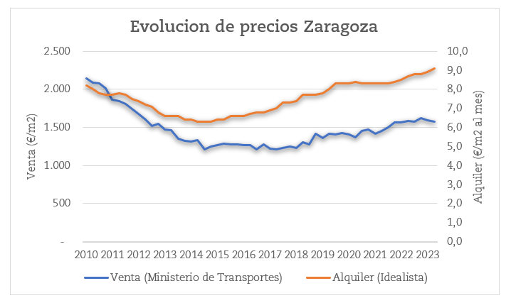 PRECIOS DE LA VIVIENDA EN ZARAGOZA EN VENTA (eje izdo, €/m2) y ALQUILER (€/m2 al mes)