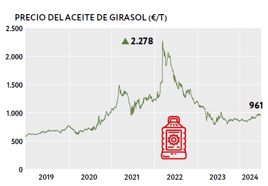 El precio del aceite de girasol ha subido un +12% en lo que llevamos de año. Ucrania y Rusia son los principales productores mundiales. La “estabilización” de los conflictos geopolíticos han hecho bajar el precio de este producto un -58% desde marzo de 2022, llegando hasta niveles de 2020. Las previsiones son que el crecimiento en la producción de aceite de girasol se ralentice al 0,8% anual frente al 2,9% anual de crecimiento experimentado en los últimos 10 años. Una posible paz en Ucrania aumentaría mucho la producción.