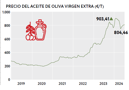 El precio del aceite de oliva virgen extra lleva un -9% de bajada en este 2024. A pesar de la incertidumbre en esta primera mitad del año, la realidad es que acumula un 26% de revalorización respecto a su precio en junio del año pasado y un increíble +138% respecto a la misma fecha en 2022, según datos del Ministerio de Agricultura, Pesca y Alimentación. España es el primer exportador mundial de esta materia prima, produciendo el 45% de la oferta mundial. Los dos años de malas cosechas en nuestro país, junto a la prohibición indefinida a las exportaciones en Turquía y la fuerte subida de aranceles a la exportación en Marruecos, ayudaron en la gran subida del aceite de oliva virgen extra.