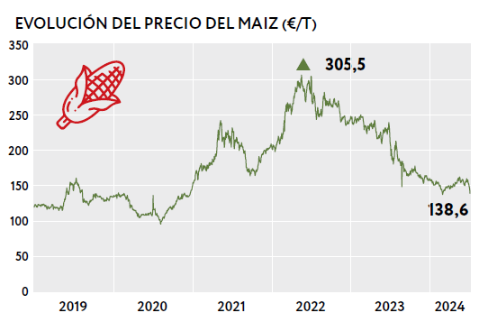 El valor de esta materia prima registra un descenso acumulado del -55% desde mayo de 2022, y una bajada del -8% en el último mes, en datos del Ministerio de Agricultura estadounidense. Brasil y Argentina mejoran su producción. A futuro, se espera un comportamiento similar al del trigo, con una contracción en el corto plazo para recuperar su crecimiento medio en el futuro. El maíz es el principal producto agrícola utilizado mundialmente para alimentar al ganado, y se espera que continúe siéndolo durante la próxima década. Se prevé que el consumo de este producto aumente un 1,2% anual, un ritmo mucho menor al 2,1% anual vivido en la última década. También se espera que EE.UU. vuelva a convertirse en el principal exportador mundial, al aumentar la superficie sembrada.