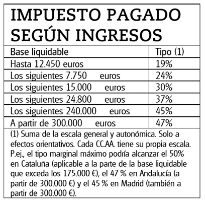 No reflexionar un mínimo antes de comunicar tal decisión puede costarle mucho dinero en impuestos. Y es que el dinero que reciba por el rescate de su plan de pensiones habrá de sumarlo al resto de sus ingresos (del seguro, trabajo…), lo que implicará pagar más impuestos en el IRPF ya que el tipo aplicable será más alto (vea tabla adjunta). Ahora bien, si espera al menos hasta el año que viene, aunque cobre la pensión máxima, sus ingresos serán mucho menores y menor también el tipo impositivo que le apliquen.