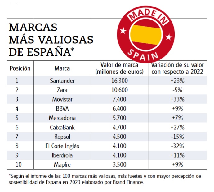 Según este ranking, Santander es la marca más valiosa de España. Con un valor de 16.300 millones de euros (un 23% más que en 2022) se vuelve a colocar a la cabeza del ranking de valor de marca español muy por delante de Zara, la segunda más valiosa, que posee un valor de 10.600 millones de euros ( y ello a pesar de una caída del 5% con respecto al año pasado). La medalla de bronce del pódium es para Movistar con un valor de 7.400 millones de euros, un 33% más que en 2022.