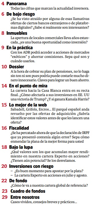 Acabamos de cerrar nuestra revista mensual nº 126 correspondiente al mes de septiembre de 2024. Le recordamos que no le hace falta esperar a recibirla por correo para poder consultarla. Puede descargársela en formato pdf en www.ocu.org/inversiones/publicaciones. He aquí el sumario: