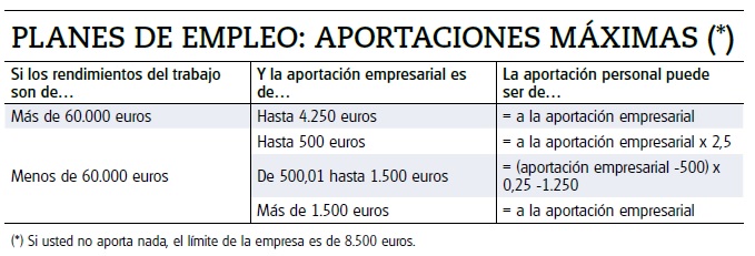 – 1.500 euros anuales. En el caso de los planes de empleo que son promovidos con las aportaciones de las empresas a favor de sus trabajadores, el límite máximo de las aportaciones empresariales es de hasta 8.500 euros. Vea tabla.
