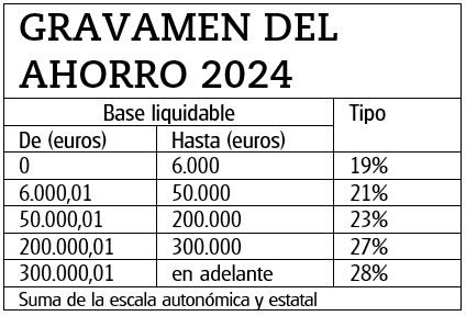 El año pasado se añadieron dos tramos a la escala por la que tributa la base liquidable del ahorro, de la que forman parte tanto los rendimientos del capital mobiliario (dividendos, intereses de cuentas, depósitos, deuda pública…) como las ganancias de patrimonio (ventas de acciones, fondos de inversión, de in-muebles…). La escala de gravamen de la base del ahorro se mantiene durante 2024, con los siguientes tramos: