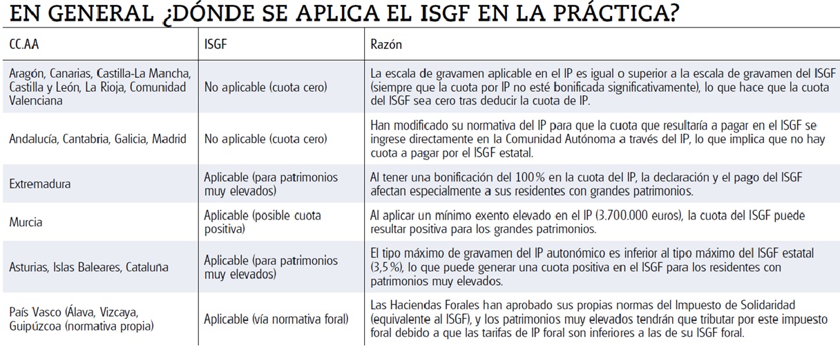 · También se aplica en el País Vasco. En Navarra se ha modificado la escala de gravamen del IP para que sus contribuyentes tributen en este en lugar de por el ISGF.