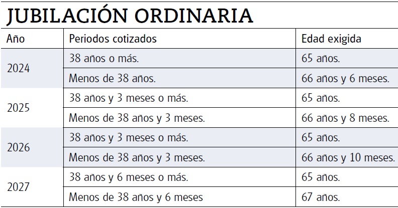 Para causar derecho a la pensión de jubilación ordinaria, en el año 2024 hay que contar con la edad de 66 años y 6 meses, salvo que se acredite haber cotizado a la Seguridad Social un periodo como mínimo de 38 o más años, en cuyo caso podrá acceder a la pensión de jubilación a los 65 años. Por otra parte, se mantiene la edad de 65 años para acceder a la pensión de jubilación a los trabajadores que tuvieran la condición mutualista el 1 de enero de 1967, o en una fecha legalmente equivalente.