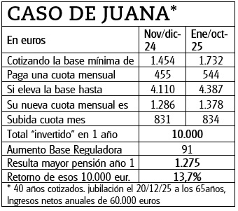 Doña Juana tiene 63 años, cumple los 65 poco antes de las navidades de 2025. Tras una vida profesional muy larga, lleva más de 38,5 años cotizados, sabe que va a percibir una pensión del 100% de la base reguladora y no se plantea la jubilación anticipada. Habiendo cotizado siempre por el mínimo, quiere saber si puede hacer algo hasta que cumpla los 65 años para mejorar su pensión sabiendo que puede destinar a este propósito 10.000 euros al año. Tiene unos ingresos netos anuales de 60.000 euros (5.000 al mes). Cada mes paga 455 euros de cuota de autónomos, por una base de 1.454 que, en su caso, podría elevar hasta la máxima base de cotización de 4.721.