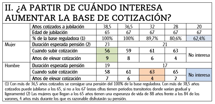 Aumentar la base de cotización u optar por la mínima depende en buena medida de su edad y años cotizados, es decir de cuantos años le queden hasta la jubilación (vea nota al pie de la tabla II). Y lo que pueda estimarse de forma razonable que pueda disfrutar de ella, por lo que también afecta su sexo. Ya le adelantamos que invertir en subir la cotización para la jubilación antes de los 56 años no interesa en ningún caso. Y finalmente depende de sus rendimientos netos y nivel de ahorro anual al condicionar el máximo que puede invertir en aumentar la cotización.