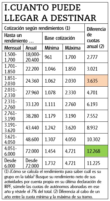 Como tiene rendimientos altos puede subir sus bases de cotización bastante, hasta los máximos. Esto supone hasta 12.000 euros más de cuota al año, vea tabla I en verde (hemos hecho los cálculos con 10.000 euros, pero se podría apurar al máximo).