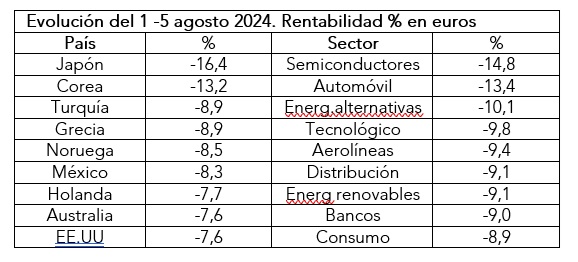 Ya advertimos en nuestro último boletín semanal que no era de extrañar que las bolsas en verano nos pudieran dar alguna sorpresa para la que debíamos estar preparados. Y así ha sido. El primer lunes de este mes se ha saldado con un fuerte tropezón bursátil en todas las bolsas mundiales. Especialmente en Japón donde el Nikkei se ha dejado un -12,4%, arrastrado por la fortaleza del yen y la reciente subida de tipos de interés en Japón. Sin embargo, estos recortes ya vienen de semanas atrás: las bolsas mundiales ceden un -7,6% en lo que va de mes. Y es que la presentación de los resultados semestrales ha dejado entrever algunas dudas sobre las perspectivas de las tecnológicas. Sector que, hasta ahora, estaba sustentando las alzas bursátiles.