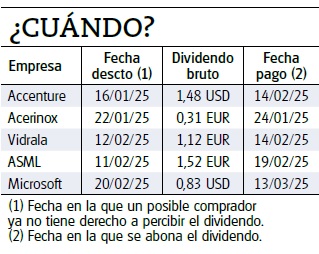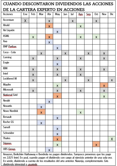 En los Estados Unidos hay empresas que no esperan a la Junta y fijan el dividendo que pagarán en los primeros meses del año repartiéndolo en pagos trimestrales. De la cartera Experto en acciones es el caso de Accenture, Coca-Cola, Corning, IBM, Lockheed Martin o Microsoft (consulte sus fichas detalladas en el comparador de acciones). Vea en la tabla siguiente las fechas de descuento en 2024 de las acciones de la cartera Experto en acciones.
