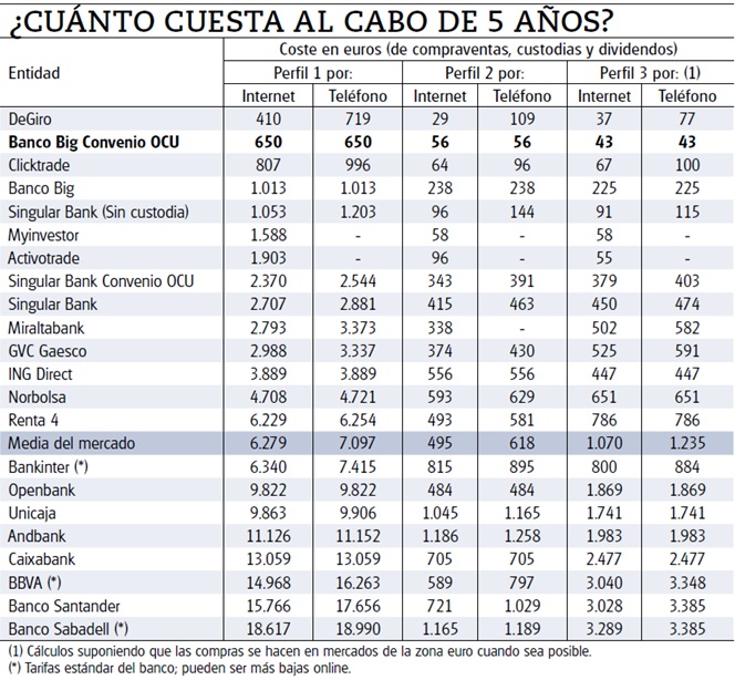 · En general, la operativa a través de los grandes bancos suele ser más cara que con los pequeños o que directamente con brókeres especializados. Incluso dentro de un mismo intermediario, la operativa por internet es más barata que la operativa telefónica, y ésta más barata que por oficina. Entre los grandes bancos solo CaixaBank aplica las mismas tarifas con independencia del canal.