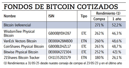 · Ahora bien, si usted es fan de la criptomoneda y siempre y cuando no le importe jugársela con su dinero -que sea poca cantidad y que no le importe perder-, algunos (ETC Exchanged Traded Commodities) de bitcoin, o incluso ETN (Exchanged Traded Notes), vea las diferencias entre unos y otros en nuestro número de abril pasado, podrían estar en su punto de mira. Si desea saber cuáles en concreto, haga clic en el botón siguiente