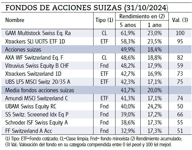 Tal y como usted comenta, en esta categoría llama la atención la disparidad de resultados entre los fondos de gestión activa. Algunos de ellos lo han hecho muy bien como p.ej. el GAM Multistock Swiss Eq. Ra con un +61,9% a 5 años, frente al +49,9% de las acciones suizas en su conjunto o el +41,7% de la media de fondos de la categoría (vea tabla). Pero otros como el FF Switzerland A Acc se han quedado en apenas la mitad, un +32,9% a 5 años.
