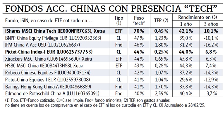 · Así, tras analizar en detalle los fondos de acciones chinas que apuestan más en firme por el sector “tech” hemos corroborado que este ETF sigue ocupando el lugar más destacado. De ahí que sea la mejor alternativa para exprimir al máximo el (intacto) potencial de esta apuesta sectorial. Ya en un segundo escalón puede haber otras alternativas interesantes, entre las que destaca la clase limpia del fondo tradicional Pictet China Index I (Silver Alpha), que trata de replicar el índice MSCI China.