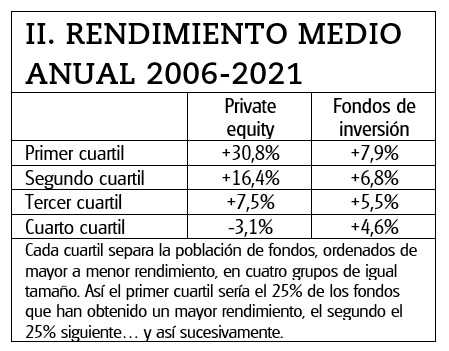 • En la tabla II comparamos los rendimientos de la media de las ECR con la media de los fondos inversión. Ahora bien, teniendo en cuenta el mercado en el que invierten las ECR, habría que compararlos más bien con fondos growth o de empresas en desarrollo como p.ej. el Groupama Avenir Euro que en ese periodo de 2006 a 2021 obtuvo un +11,4% anual medio, o en 2021 un +33%.