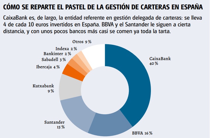Para tratar de poner todos los puntos sobre las íes hemos puesto la lupa en la oferta existente en España dirigida al particular, es decir, para importes inferiores a 100.000 es decir, para importes inferiores a 100.000 euros. Como era de esperar nos hemos centrado en el escaparate de los bancos que, a fin de cuentas, es la gestión delegada en la que invierten los españoles. De hecho, el trozo más grande del pastel se lo lleva CaixaBank que, por sí sola, acapara el 40% del patrimonio total invertido en este servicio. Si sumamos la del Santander y del BBVA, solo entre los tres se reparten ya un 71% del pastel. Es decir, 7 de cada 10 euros invertidos de acuerdo con un servicio de gestión delegada se hace bajo los parámetros de estos tres bancos. Casi nada. Con el resto de las entidades analizadas hemos llegado a superar el 90% del total de la oferta (vea gráfico), un porcentaje que nos parece más que representativo.