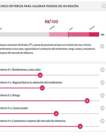 Después comparamos todos los fondos de una misma categoría entre sí para tratar de dar con los mejores en base a cinco grandes criterios, lo que da lugar a una nota final de entre 0 y 100 puntos.